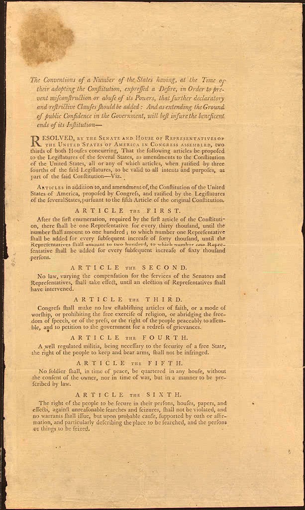 It cannot be a secret to the gentlemen in this house, that, notwithstanding the ratification of this system of government by eleven of the thirteen United States, in some cases unanimously, in others by large majorities; yet still there is a great number of our constituents who are dissatisfied with it; among whom are many respectable for their talents, their patriotism, and respectable for the jealousy they have for their liberty, which, though mistaken in its object, is laudable in its motive. There is a great body of the people falling under this description, who as present feel much inclined to join their support to the cause of federalism, if they were satisfied in this one point: We ought not to disregard their inclination, but, on principles of amity and moderation, conform to their wishes, and expressly declare the great rights of mankind secured under this constitution. The acquiescence which our fellow citizens shew under the government, calls upon us for a like return of moderation. But perhaps there is a stronger motive than this for our going into a consideration of the subject; it is to provide those securities for liberty which are required by a part of the community. I allude in a particular manner to those two states who have not thought fit to throw themselves into the bosom of the confederacy: it is a desirable thing, on our part as well as theirs, that a re-union should take place as soon as possible. I have no doubt, if we proceed to take those steps which would be prudent and requisite at this juncture, that in a short time we should see that disposition prevailing in those states that are not come in, that we have seen prevailing [in] those states which are.